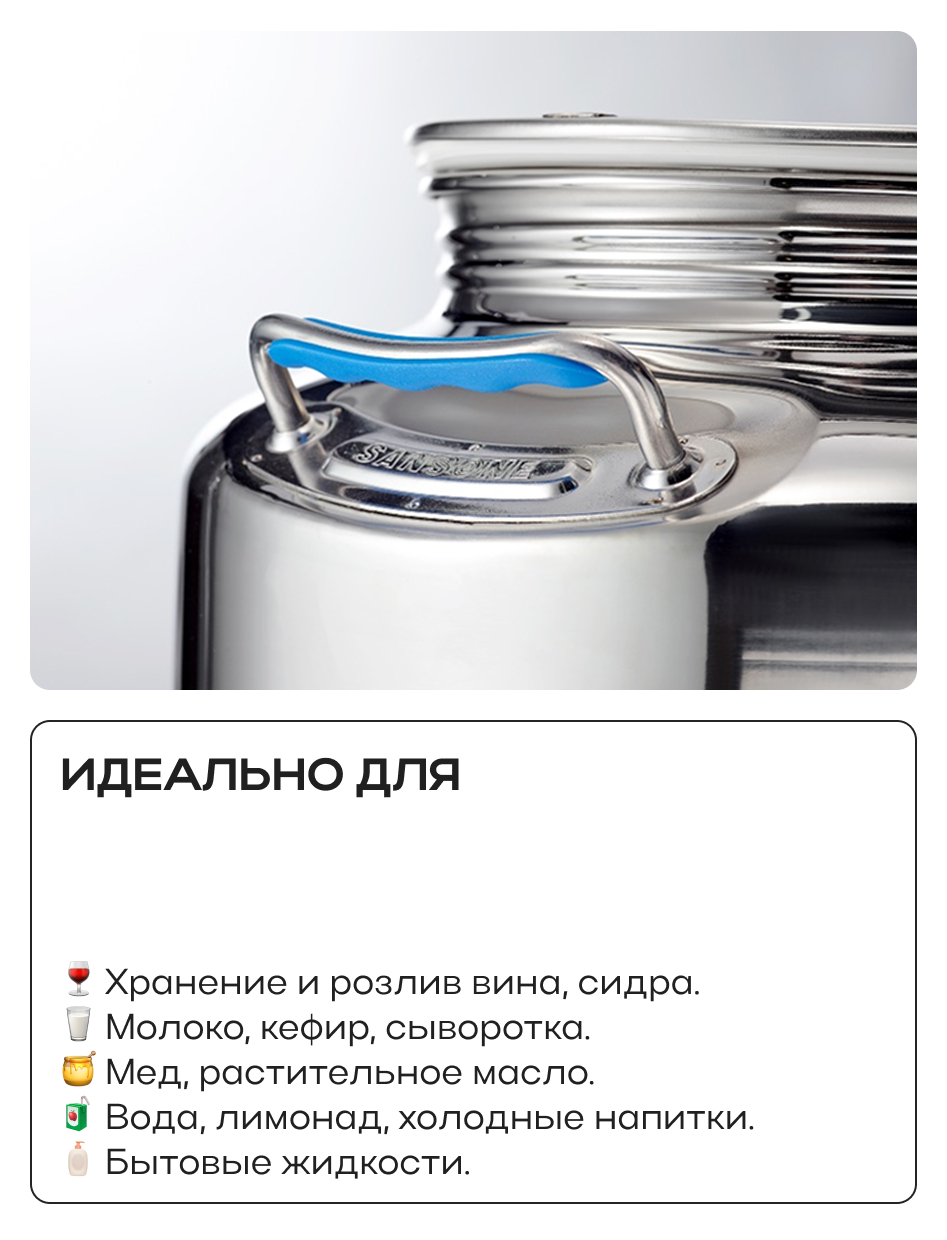 Можно использовать для длительного хранения различных жидких и сыпучих продуктов молока, вина, браги, спирта, концентратов, меда, круп, а также для брожения вин и настоек в домашних условиях.