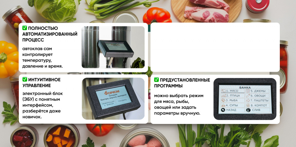 Компания «Форком» разработала и внедрила современный блок с сенсорным экраном. Понятный интерфейс и расширенные функции позволяют готовить не только традиционные консервы, но и кисломолочные продукты, топлёное молоко, йогурт, блюда по технологии су-вид и даже колбасные изделия. Автоклав становится многофункциональным кухонным помощником.