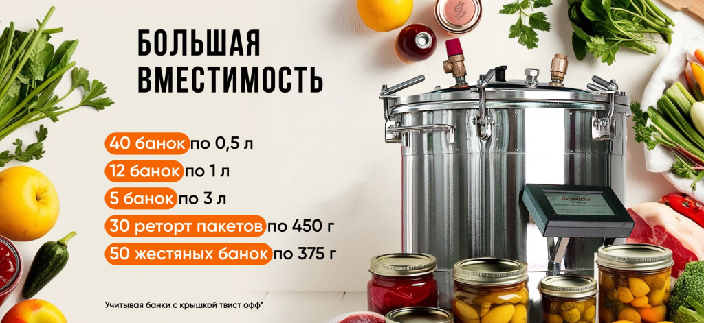 Объём 22 литра позволяет загружать до 18 банок по 0,5 л или 6 банок по 1 л за один цикл. Удобно работать как со стандартными стеклянными банками, так и с жестяными консервными банками и реторт-пакетами. Это даёт возможность делать универсальные заготовки: от мясных тушёнок до соков, овощных салатов и компотов.