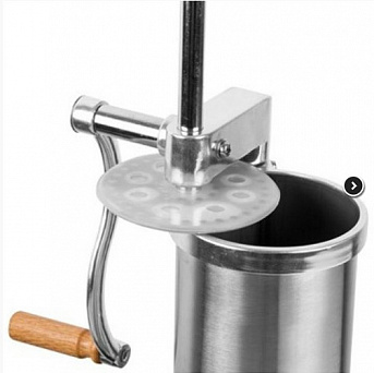 Колбасный шприц «Vanessa» 2,5 кг - ручной инструмент для набивки колбас в домашних условиях, а также для небольших мясоперерабатывающих предприятий, предприятий общественного питания. Изготовлен из нержавеющей стали. В комплект входят 4 пластиковые насадки длиной 15 см и разных диаметров - 15, 19, 22 и 25 мм, подходящие под основные виды натуральной колбасной оболочки.