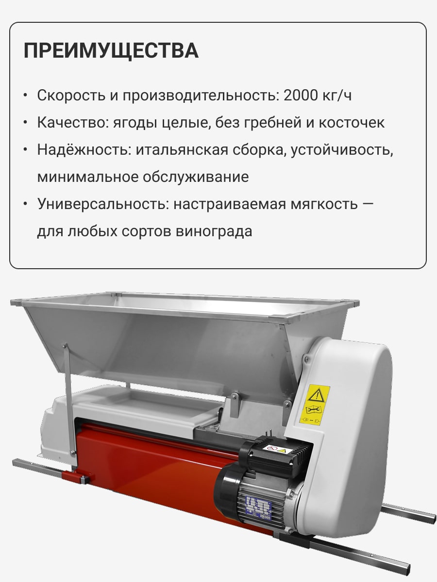 • Регулировка по мягкости дробления, что позволяет учитывать нюансы получения мезги из винограда разных сортов и размеров.