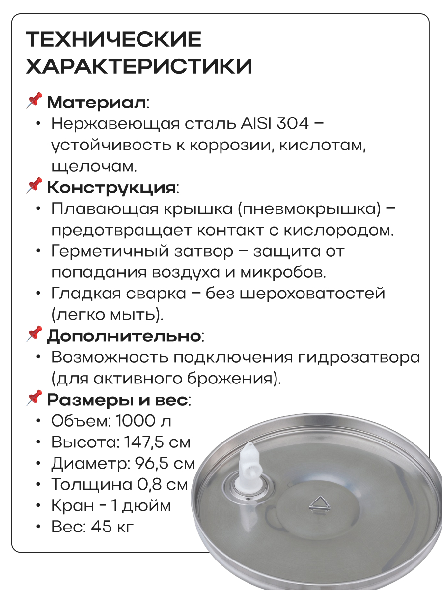 Емкость с пылезащитной и пневматической (плавающей) крышкой из пищевой нержавеющей стали. Подходит для бурного брожения (первичное), для тихого брожения (вторичное) и для длительного хранения (созревания продукта).