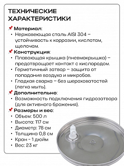 Емкость с пылезащитной и пневматической (плавающей) крышкой из пищевой нержавеющей стали. Подходит для бурного брожения (первичное), для тихого брожения (вторичное) и для длительного хранения (созревания продукта).