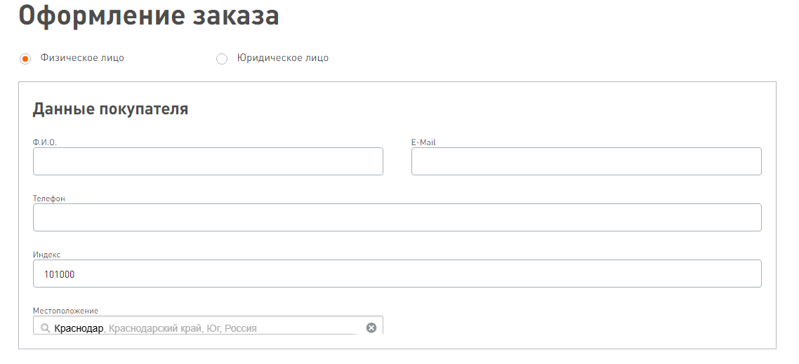 Выберите статус покупателя (по умолчанию выбрана карточка для заполнения - «Физическое лицо») и заполните данные для оформления заказа. Обязательными полями для заполнения будут действующий e-mail, для отправки уведомлений и чеков о покупке и актуальный номер телефона для связи и уточнения деталей. Для юридических лиц обязательными для заполнения полями будут «название компании», «контактное лицо», «e-mail».