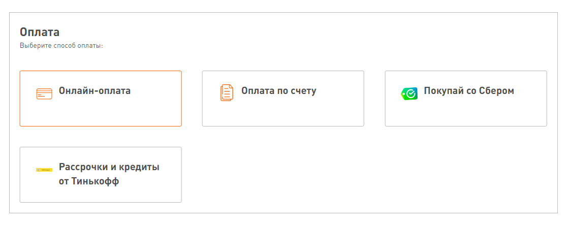 В зависимости от индивидуальных предпочтений и возможностей мы предлагаем несколько способов оплаты товара: онлайн, по счету, в рассрочку или кредит.