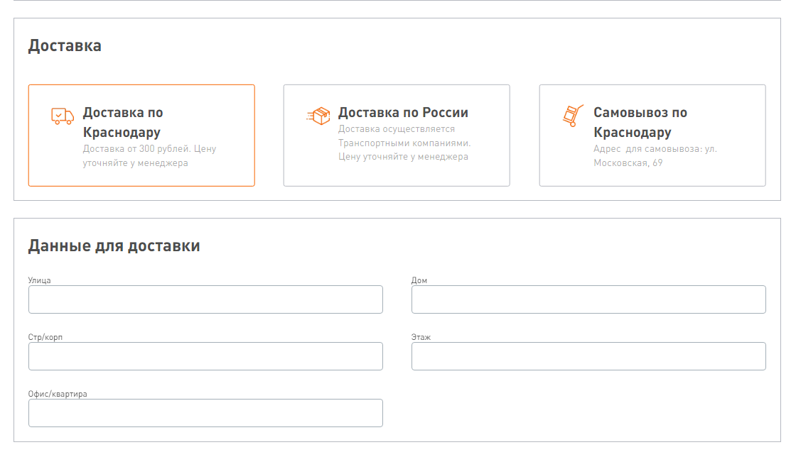 • Если вам нужна доставка по Краснодару или по России, необходимо обязательно указать адрес. Если вы выбрали «Самовывоз», то адрес можно не вносить.