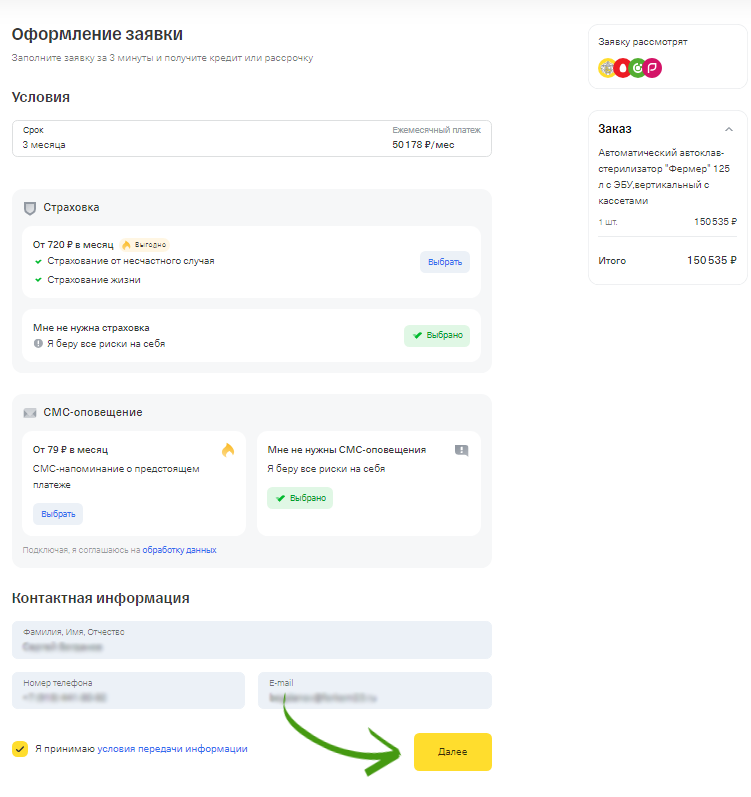 Далее вы перейдете на страницу оформления заявки, где необходимо заполнить условия, контактную информацию.