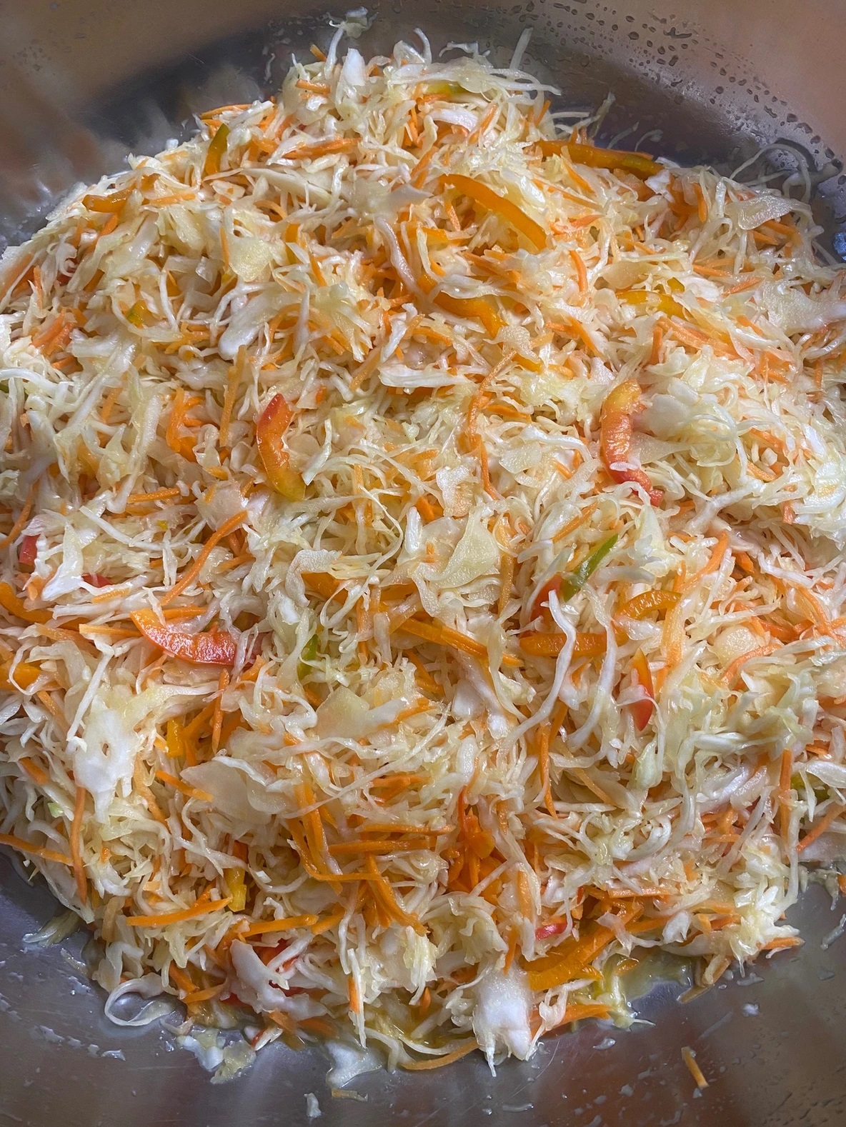 - Нашинковать капусту, перец нарезать соломкой, морковь натереть на крупной терке, чеснок мелко нарубить.