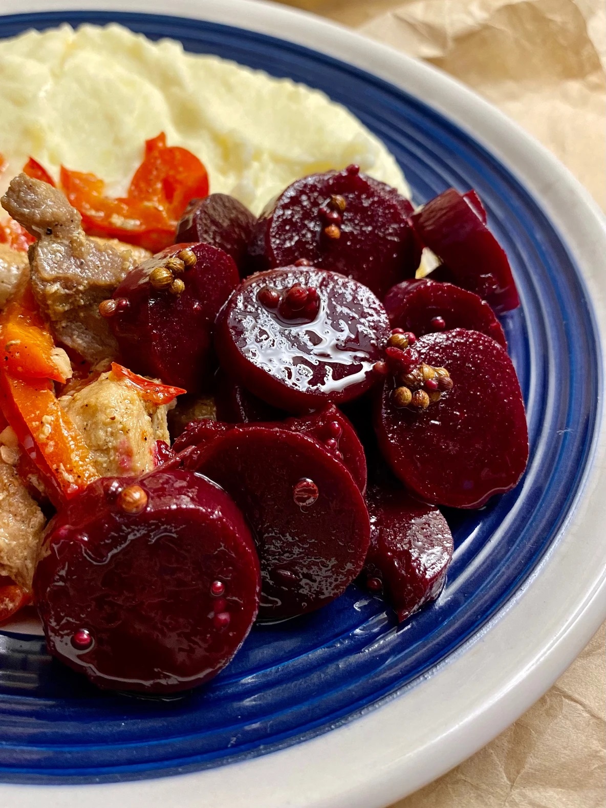 - На дно банки кладем перец, лавровый лист и раздавленный чеснок. Затем укладываем свеклу и заливаем горячим маринадом. Закручиваем банки.