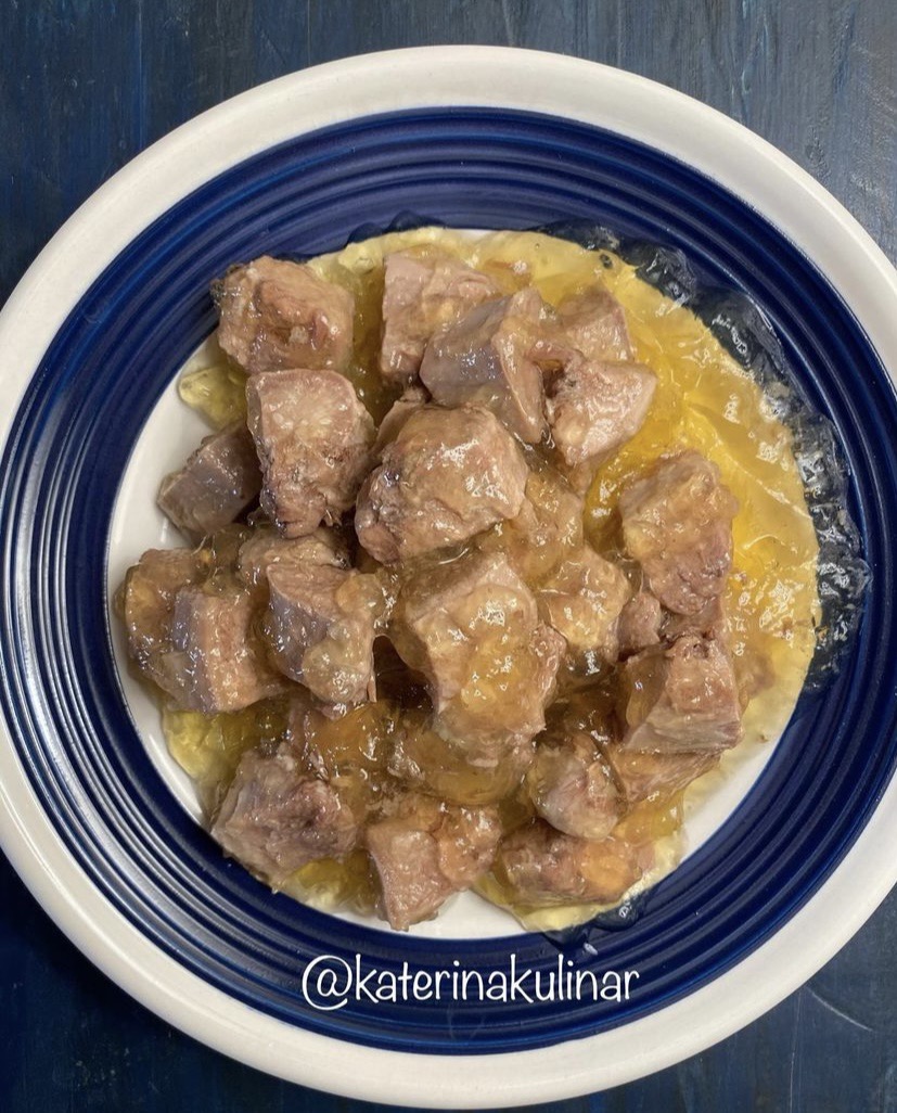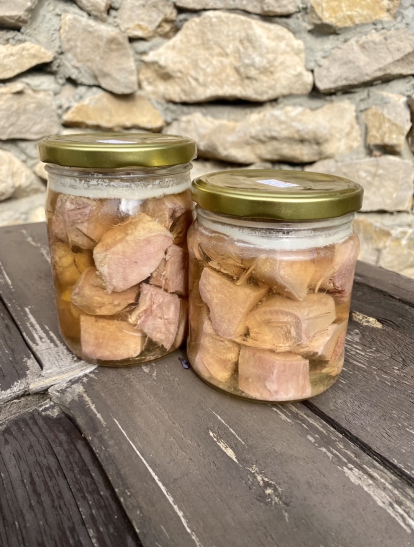 - Языки нарезать крупными кубиками, выложить в банки и залить бульоном. На каждую банку 0,5 л., примерно по ~230 г. отварного языка и ~230 мл. бульона.
